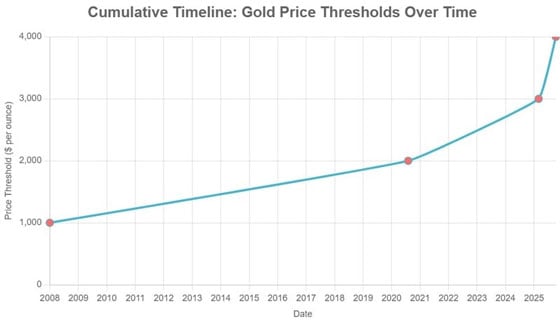 The journey from $2,000 in 2020 to $3,000 per ounce in March 2025 took about five years, or roughly 1,700 days. The latest leap has been the most astonishing. Gold cleared $3,000 per ounce in March 2025 and crossed $4,000 per ounce by October 2025. That's a span of only about seven months (roughly 200 days). This contraction in "days per new-thousand-dollar-ounces" is dramatic: from twelve years, to five, to less than one. | | | |